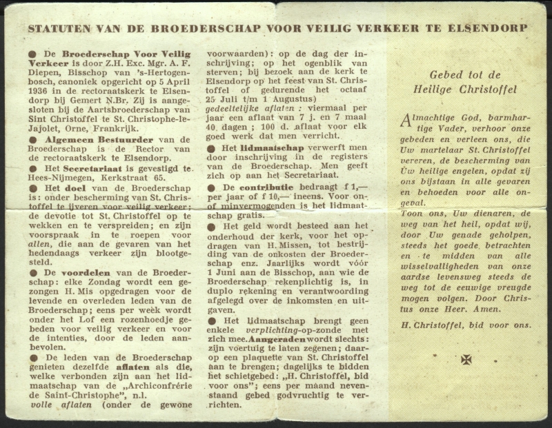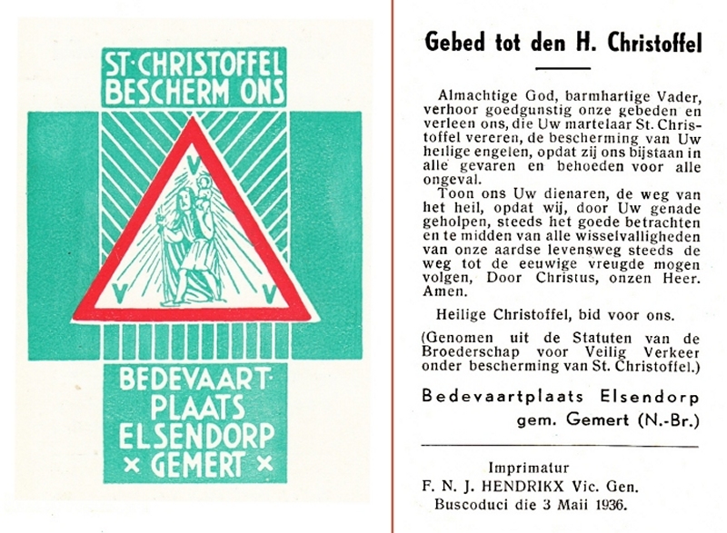 van Mgr. Bekkers, bisschop van ´s-Hertogenbosch. Na deze plechtige kerkelijke viering in een overvolle kerk besteeg de bisschop een podium en zegende alle auto´s, motors, bromfietsen, alles bij elkaar een lange plechtigheid en een mooi slot van de viering. In Annalen S.C.J. van 15 september 1961 lezen we ook nog iets over het ontstaan van de Broederschap Voor Veilig Verkeer van de hand van de Heer Iven, hoofd van de school van Elsendorp: Voordat Pater Busscher in Elsendorp kwam was hij zielzorger te Maastricht geweest, waar hij o.a. ook geestelijk adviseur was van de Handelsreizigers-vereniging St. Christoffel. Nu gebeurde het herhaaldelijk dat hij door een van de Maastrichtse handelsreizigers werd opgezocht.